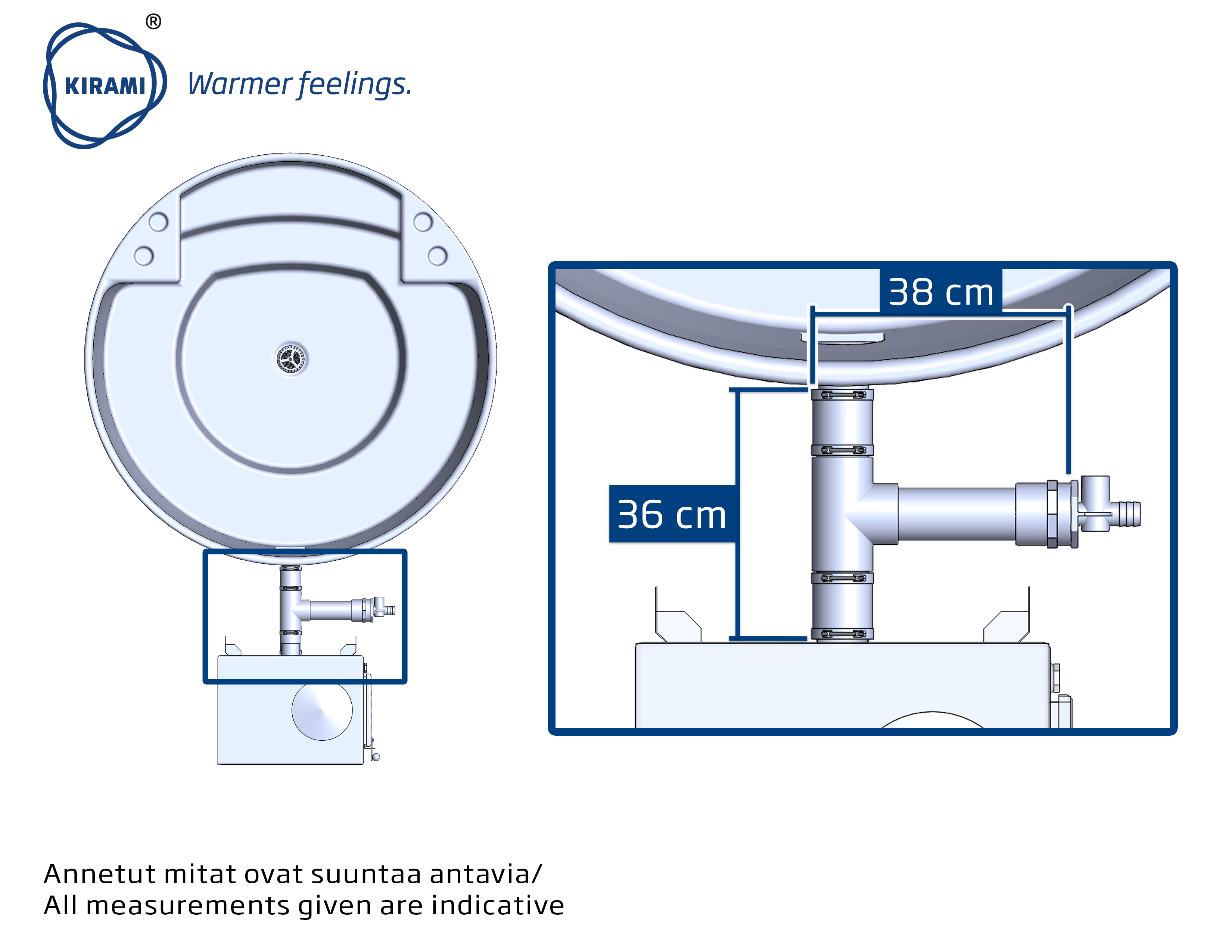 Ce kit comprend les pièces nécessaires pour installer la vanne de vidange entre le poêle et le bassin. Le produit ne contient pas de vanne de vidange Kirami, la vanne livrée avec le bassin sera transférée sur le tuyau d'évacuation du kit intermédiaire. Le tuyau d'évacuation du bassin sera obstrué avec le bouchon accompagnant le kit. La distance entre le poêle et le bain sera de 36cm après installation du kit.