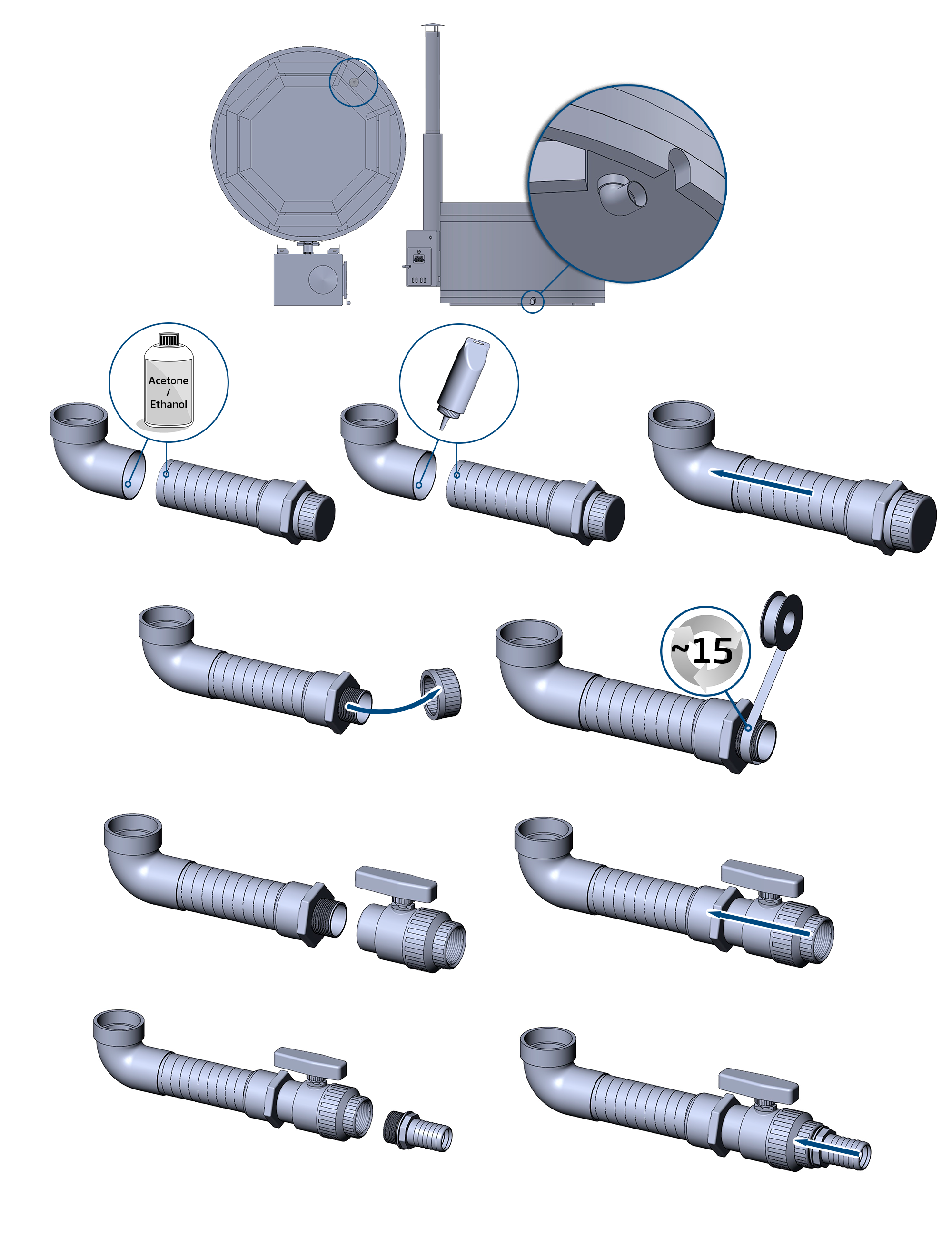 Kit d'extension de vidandge du Woody. Ce kit est composé d'une vanne à boisseau sphérique que vous pouvez installer sur un Woody. Il comporte un connecteur pour brancher un tuyau de 38 ou 32mm. Le tuyau de 50mm de diamètre fourni avec ce kit doit être collé sur le manchon coudé du Woody avec une colle PVC spéciale (fournie). La longueur du tuyau permet d'installer la vanne juste à la sortie de la paroi du bain.