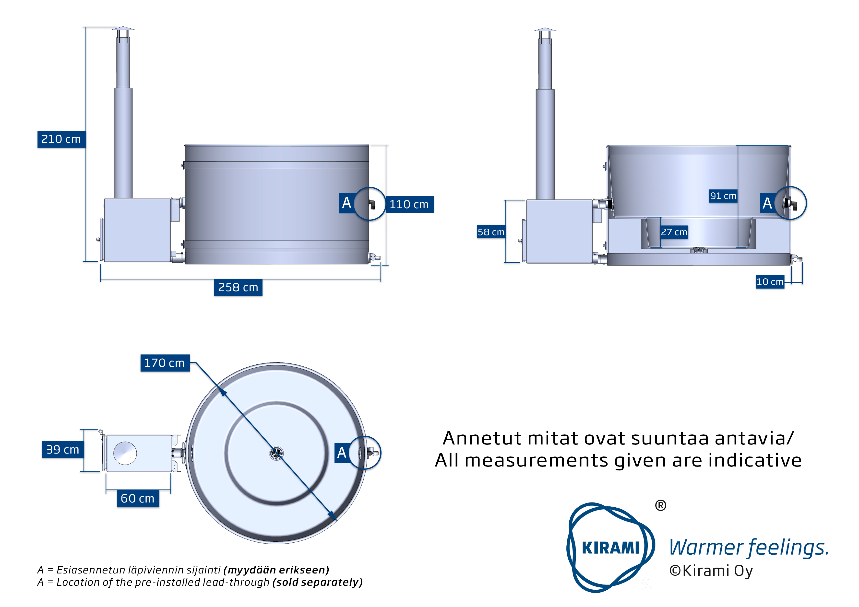 Le diamètre du bassin est de 170 cm, le volume d'eau est de 1540 litres et il est conçu pour 4-6 personnes. Le poids à sec du bassin est de 142 kg, la puissance brute du poêle CULT-si est de 36 kW et la puissance nette transférée à l'eau est de 22 kW.