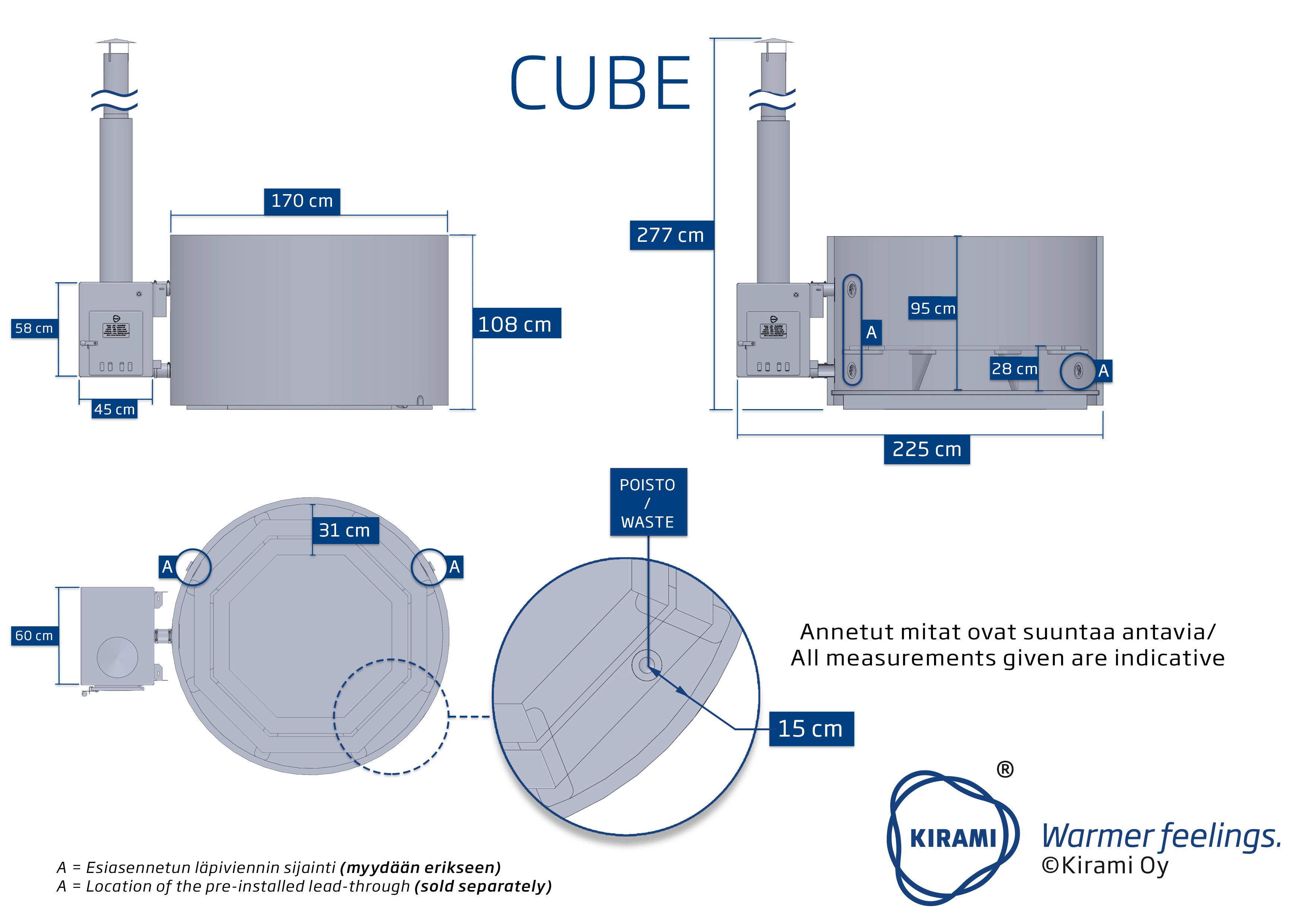 Le diamètre du bassin est de 170 cm, le volume d'eau est de 1860 litres et il est conçu pour 4-6 personnes. Le poids à sec du bassin est de 209 kg, la puissance brute du poêle CUBE est de 48 kW et la puissance nette transférée à l'eau est de 35 kW.
