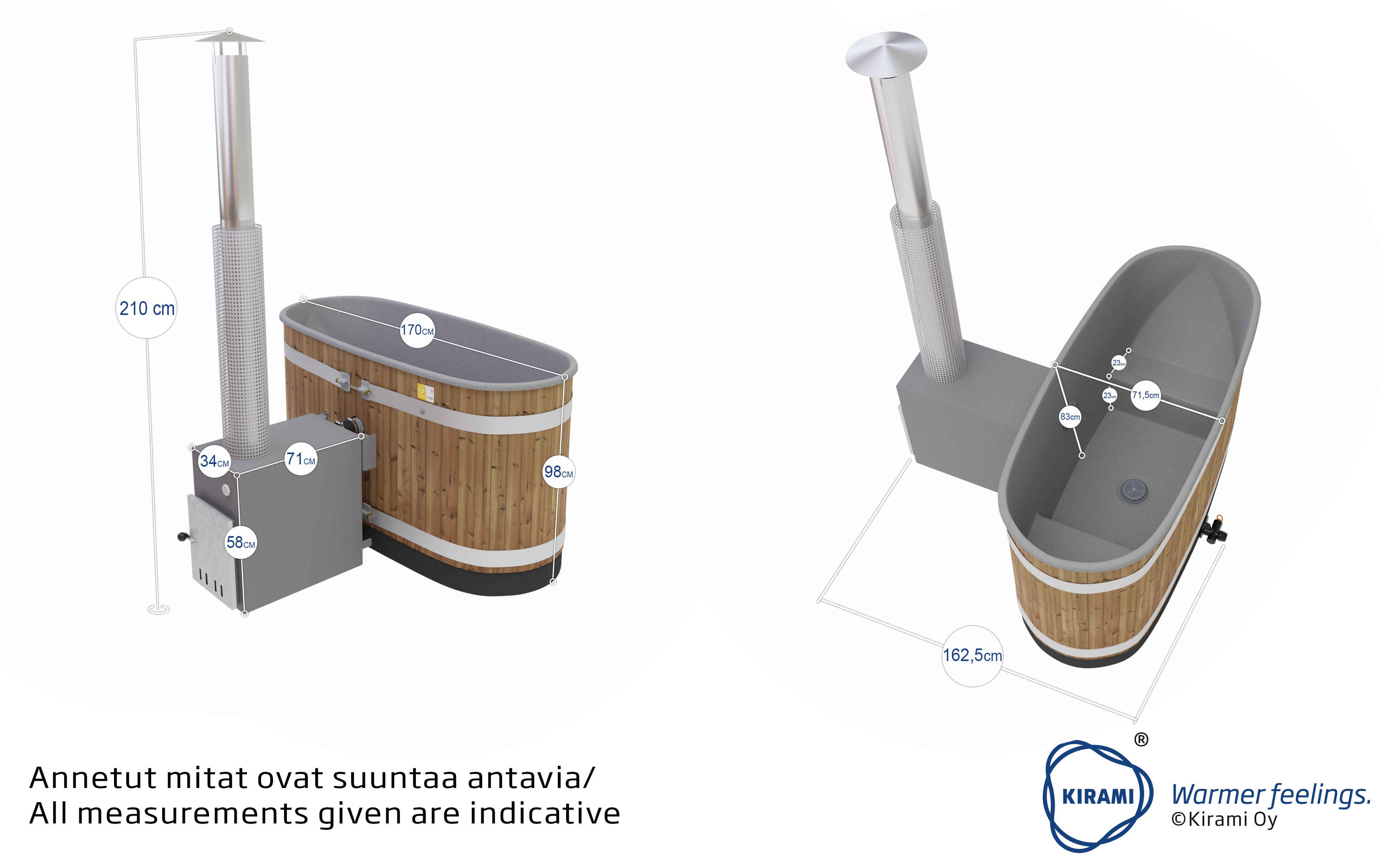 Le diamètre du bassin est de 170 cm, le volume d'eau est de 615 litres et il est conçu pour 1-2 personnes. Le poids à sec du bassin est de 92 kg, la puissance brute du poêle CULT-si est de 36 kW et la puissance nette transférée à l'eau est de 22 kW.