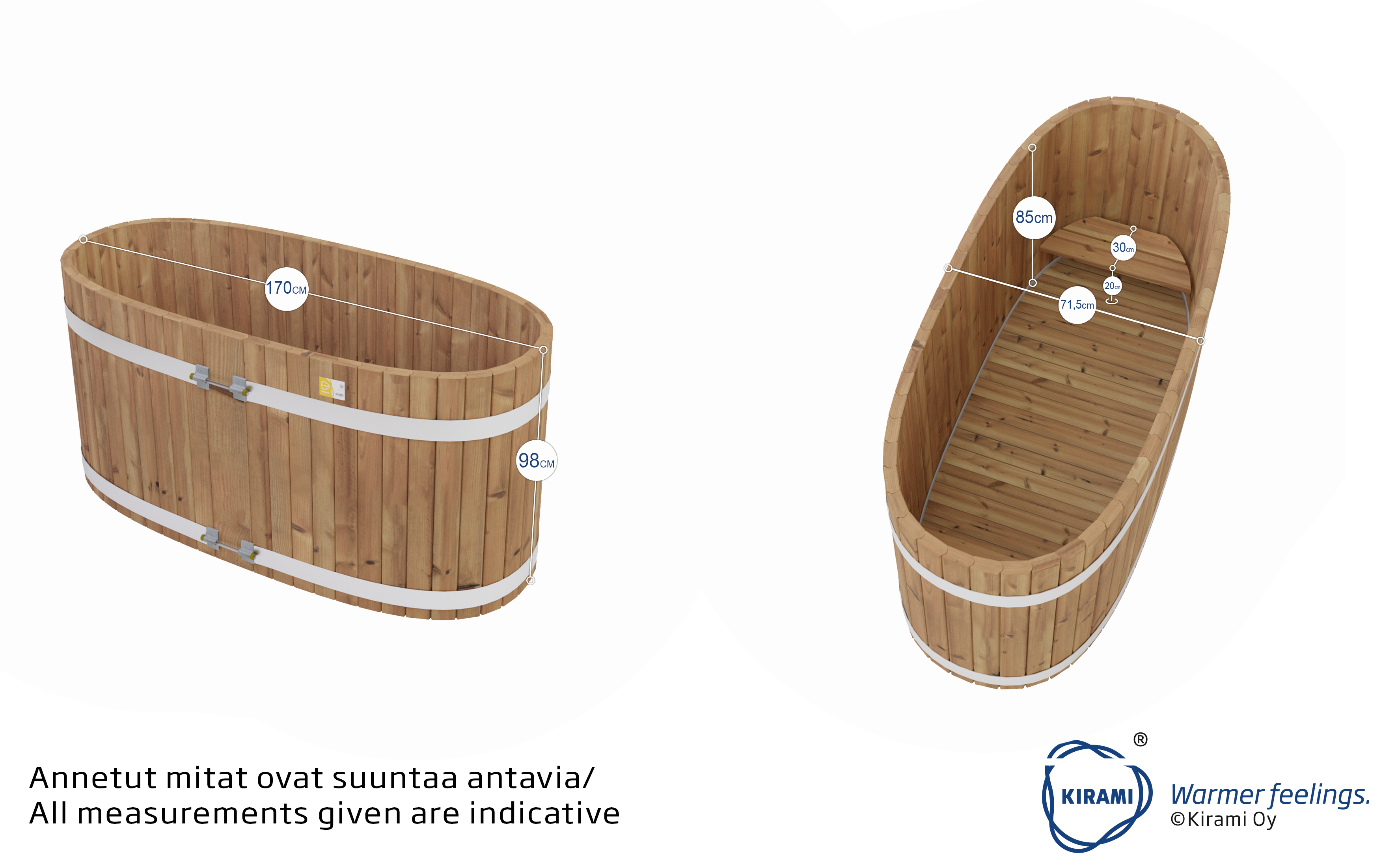 Le diamètre du bassin est de 170 cm, le volume d'eau est de 760 litres et il est conçu pour 1-2 personnes. Le poids à sec du bassin est de 100 kg.