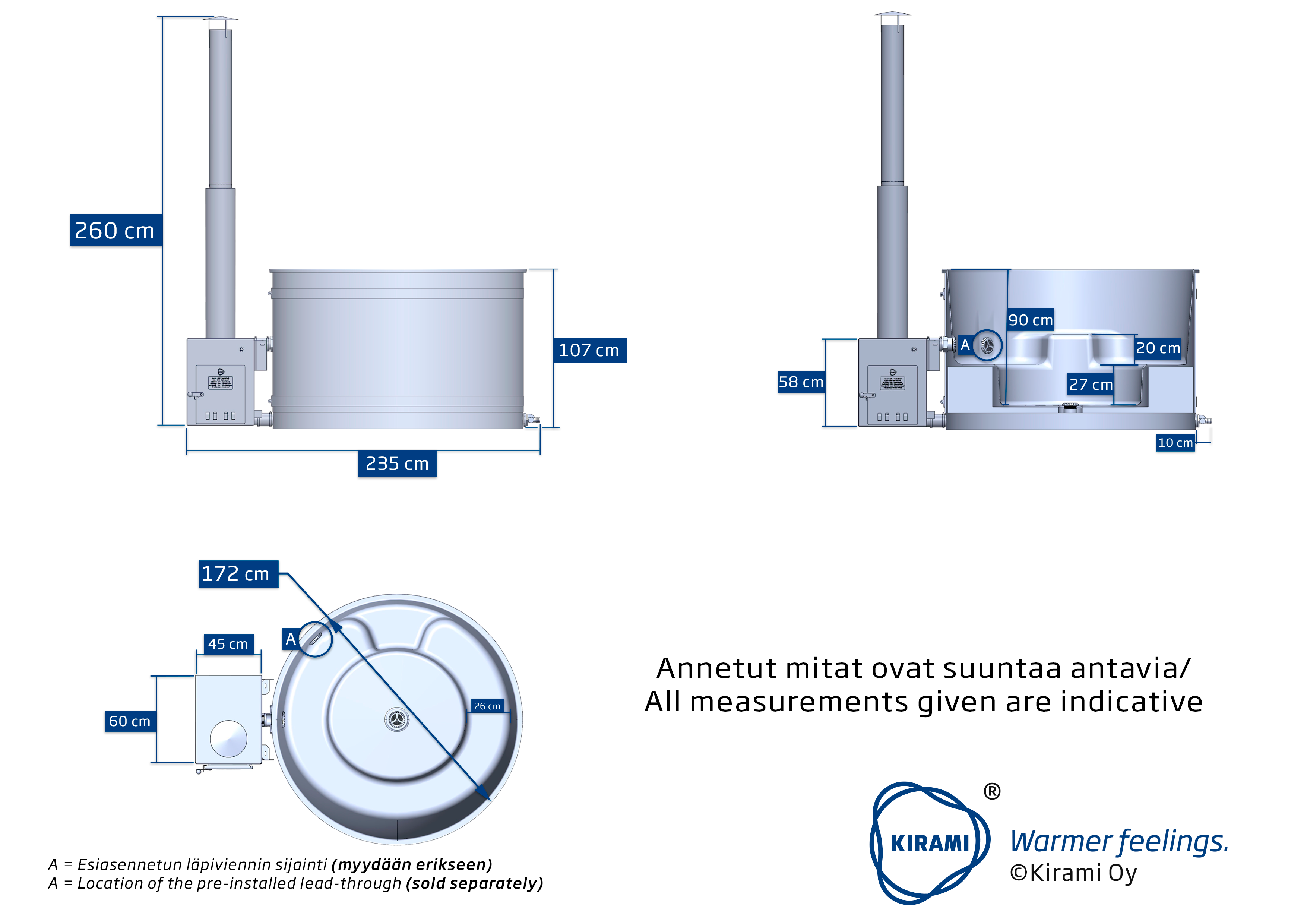 Le diamètre du bassin est de 172 cm, le volume d'eau est de 1420 litres et il est conçu pour 4-6 personnes. Le poids à sec du bassin est de 157 kg, la puissance brute du poêle CUBE est de 48 kW et la puissance nette transférée à l'eau est de 35 kW.
