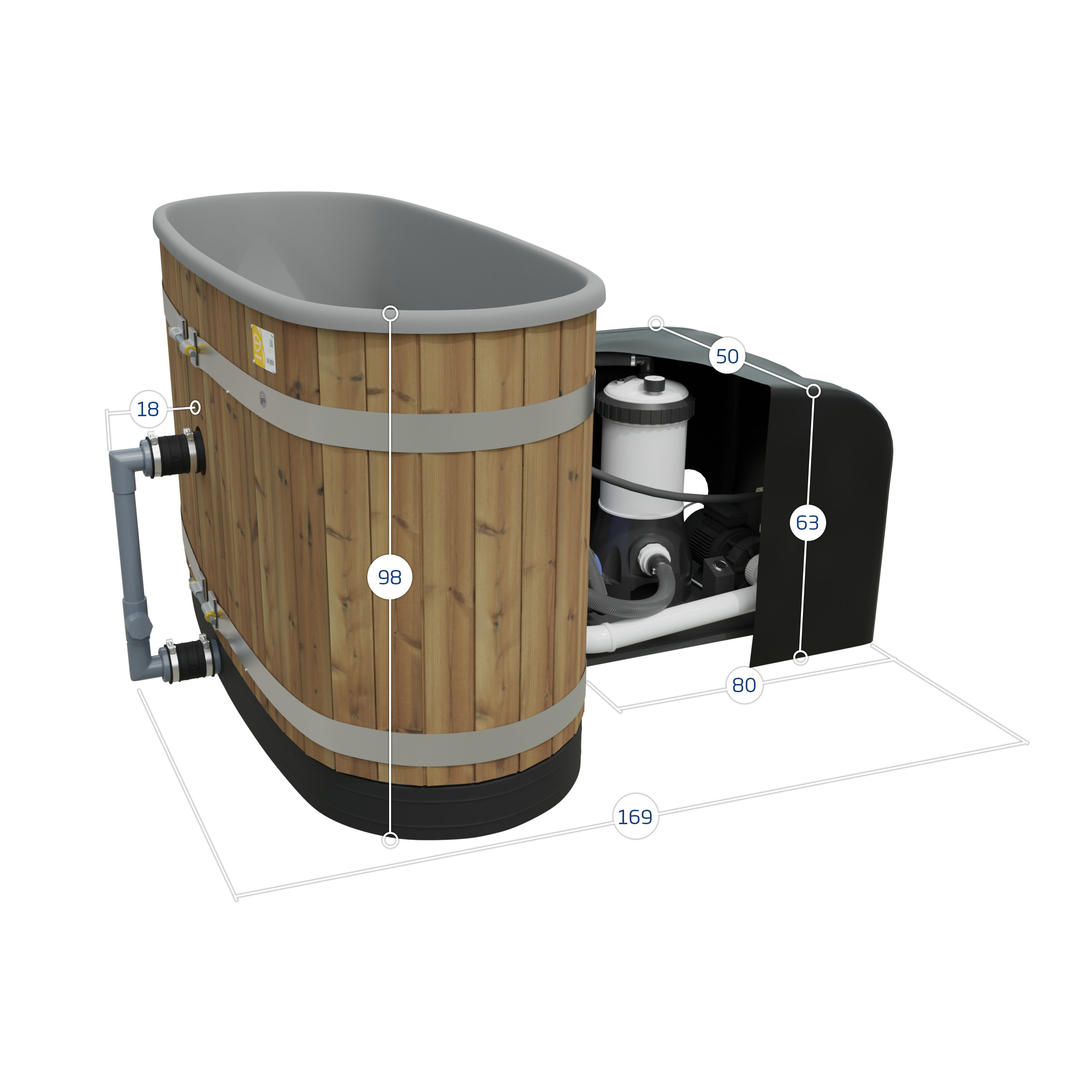 Le diamètre du bassin est de 170 cm,le volume d'eau est de 615 litres et il est conçu pour 1-2 personnes. Le poids à sec du bassin est de 95 kg, la puissance brute du poêle WaterJetsFlowSystem2kW est de 2 kW et la puissance nette transférée à l'eau est de 2 kW.