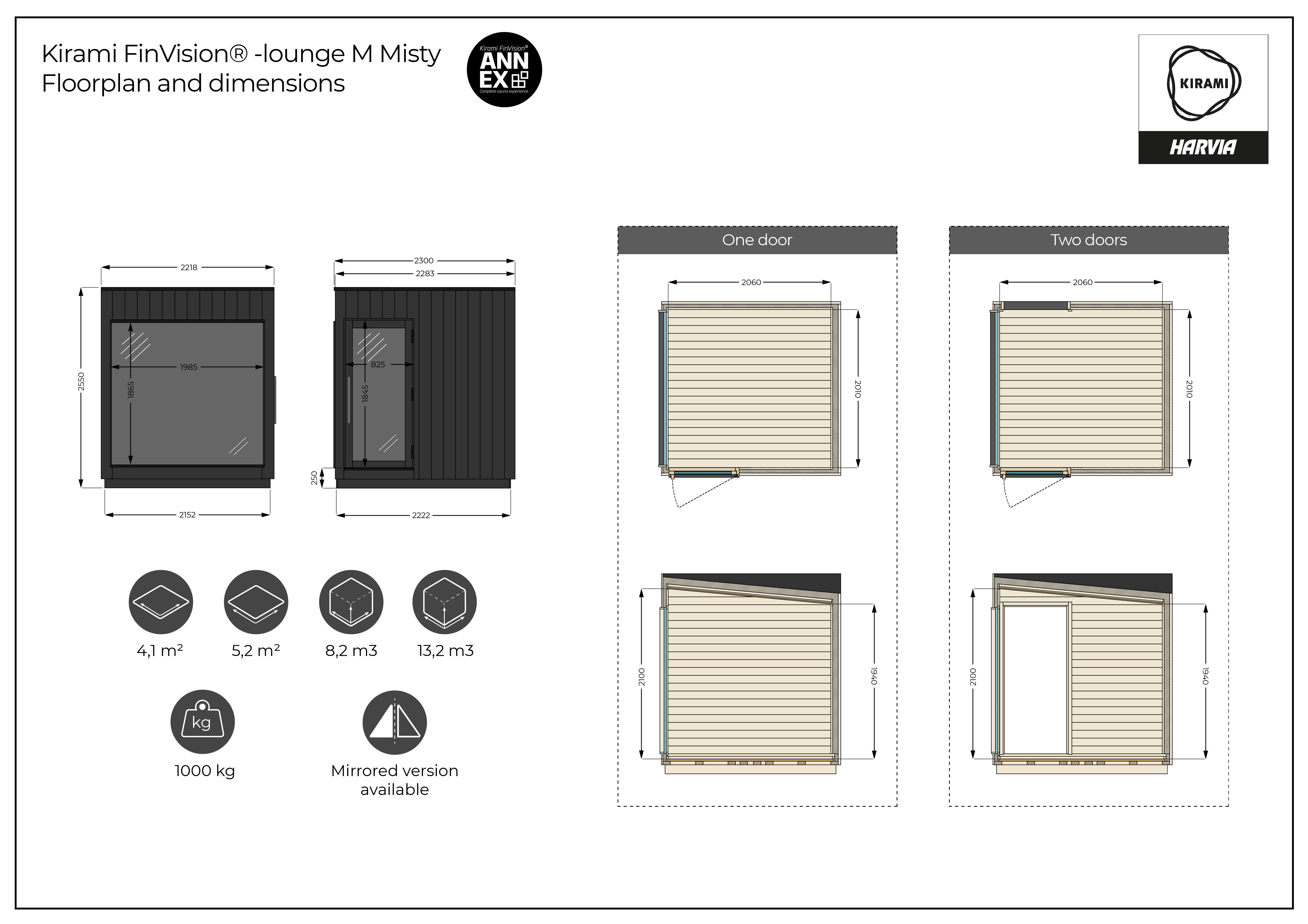Le salon d'hiver de Kirami FinVision®,- Lounge M Misty, est un module complet, indépendant, aux parois parachevées. L’ensemble s’intègre parfaitement aux autres modules Kirami FinVision® Misty ou peut également être utilisé comme bâtiment autonome. Le salon d’hiver M est suffisamment spacieux pour être agencé de différentes manières selon l’utilisation souhaitée. Le salon peut fonctionner, par exemple, comme un espace de détente ou de travail à distance. Il peut être aménagé d’un ensemble canapé, de tapis Kirami FinVision® ou de tout autre meuble de votre choix.