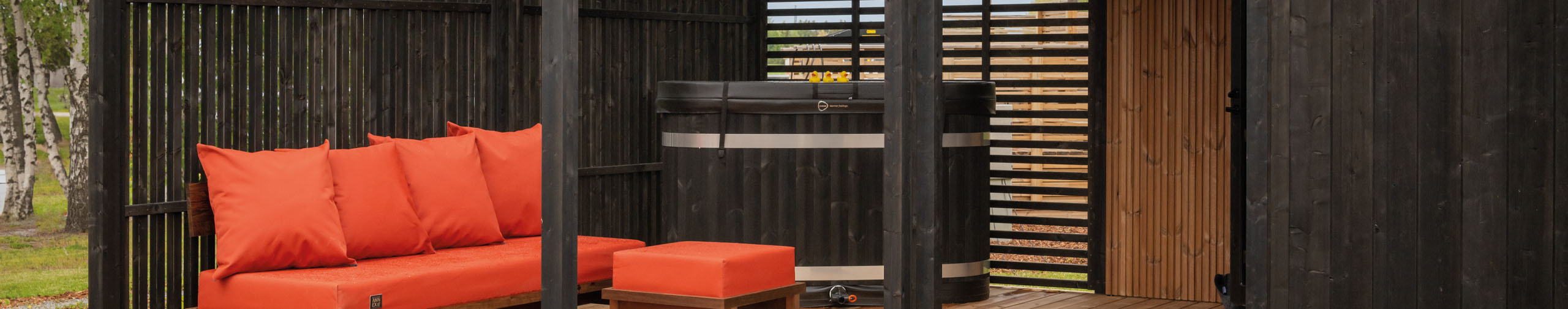 Cette pergola de plus grande taille complète parfaitement les autres modules Misty. La pergola peut également être utilisée comme un module autonome semi-couvert. Vous pouvez par exemple vous y reposer ou y installer une cuisine extérieure. La plus grande pergola peut accueillir un canapé, un bain d’immersion ou un bain nordique électrique, par exemple. Protégez votre pergola avec un brise-vue Kirami FinVision® et des plantes grimpantes, et décorez-la de lampes suspendues.